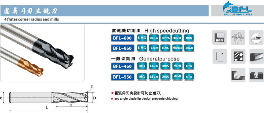 BFL Solid Carbide 4 Flutes Corner Radius End Mill, TiAlN
