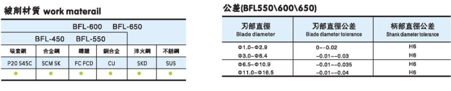 | PRODUCT CODE 产品编号 | FLUTE DIAMETER 刃径 (mm) | Radius R径(mm) | FLUTE LENGTH 刃长 (mm) | OVERALL LENGTH 总长 (mm) | SHANK DIAMETER 柄径 (mm) |