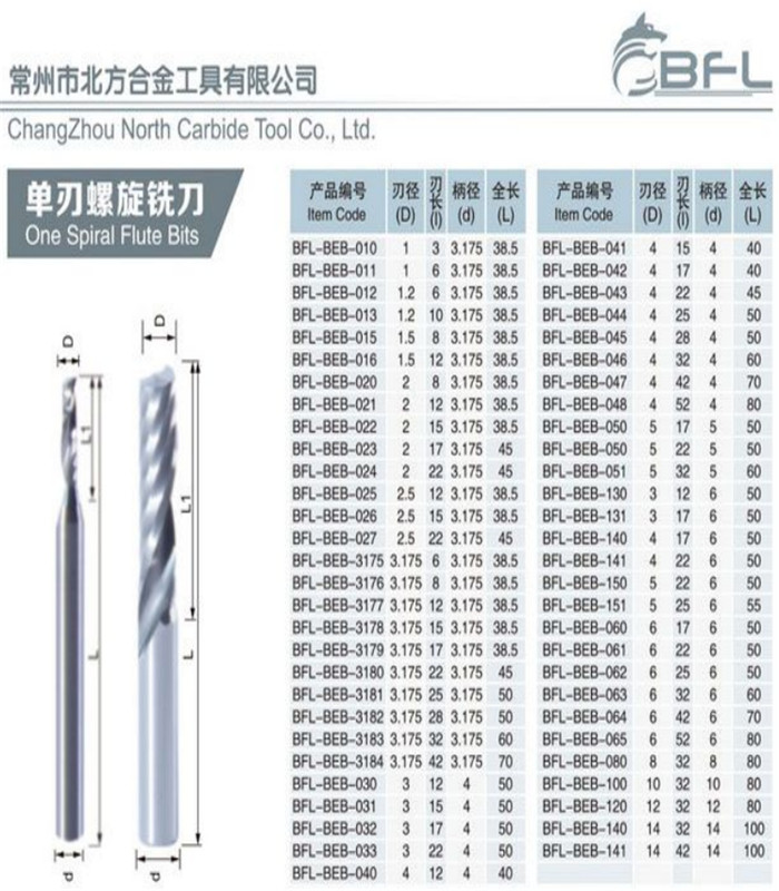 | BFL Solid Carbide Single Flute Down Cut End Mill Cutter For Wood | ||||||